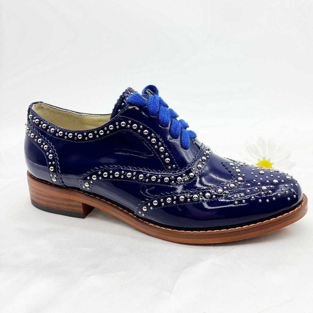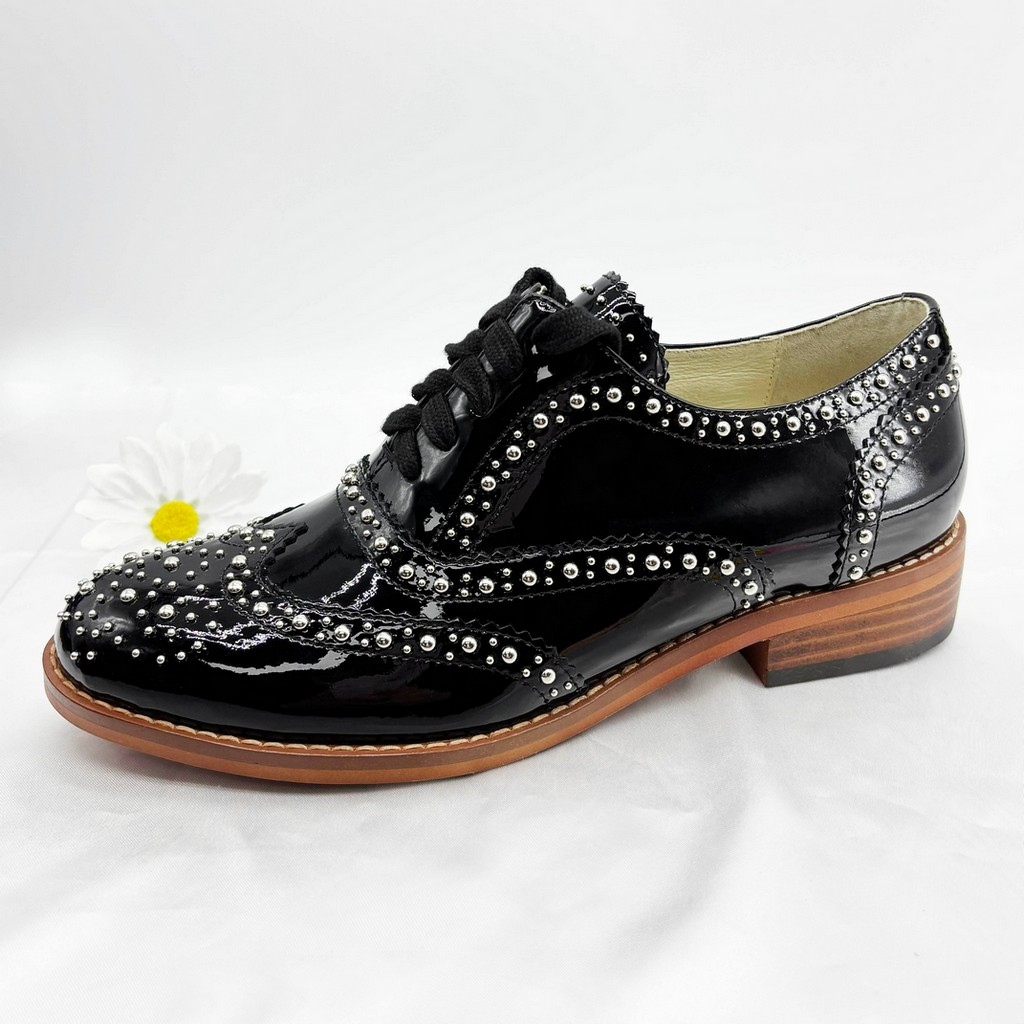 Unleash your bold style with our studded patent leather brogue oxfords—where rebellious stud detailing meets timeless brogue artistry, crafted for women who dare to merge luxury with edge. Handmade from premium patent leather and adorned with precision-placed studs, these oxfords redefine sophistication with their glossy allure, avant-garde embellishments, and tailored construction, making them a must-have for those who crave footwear that commands attention.